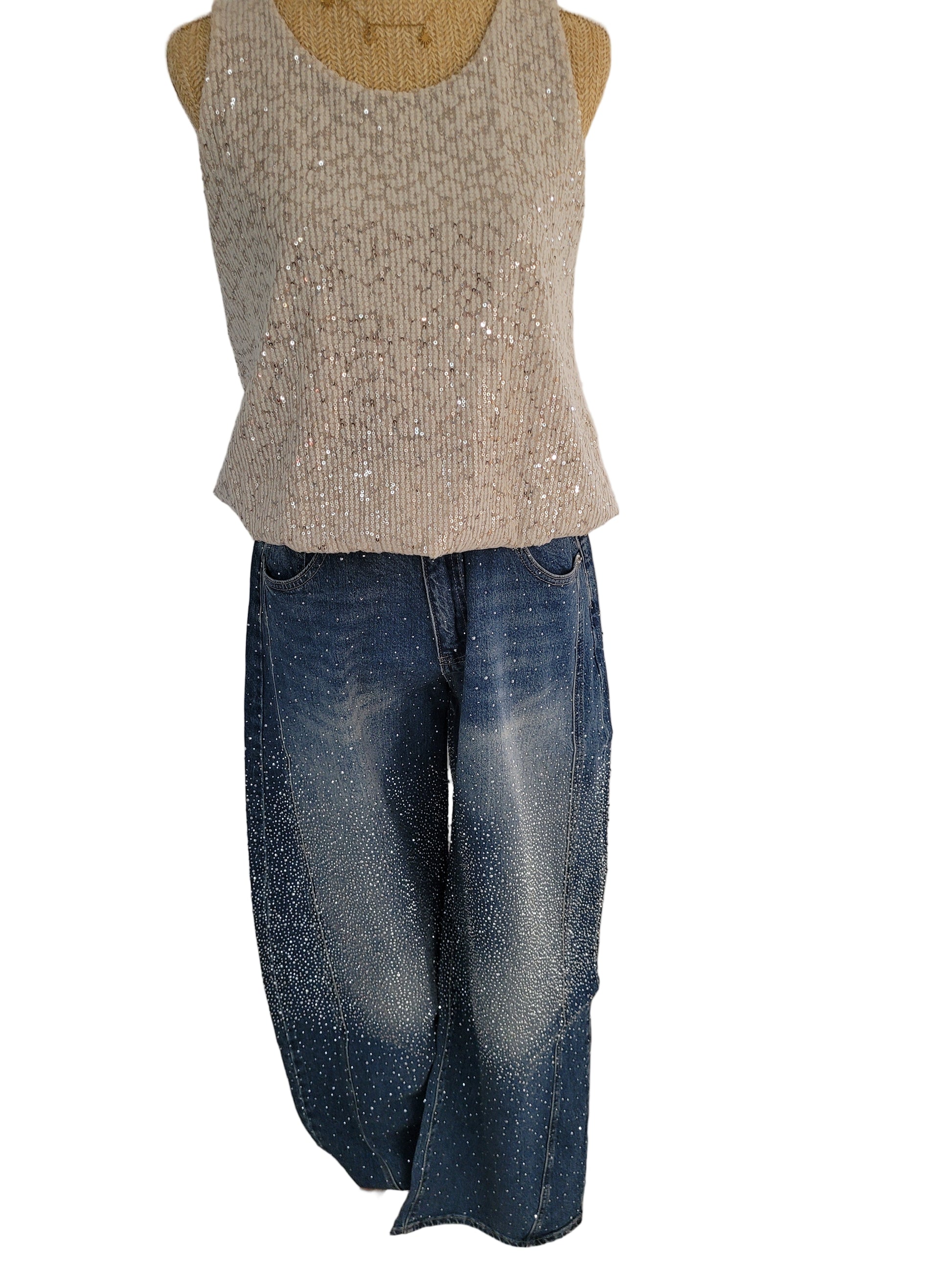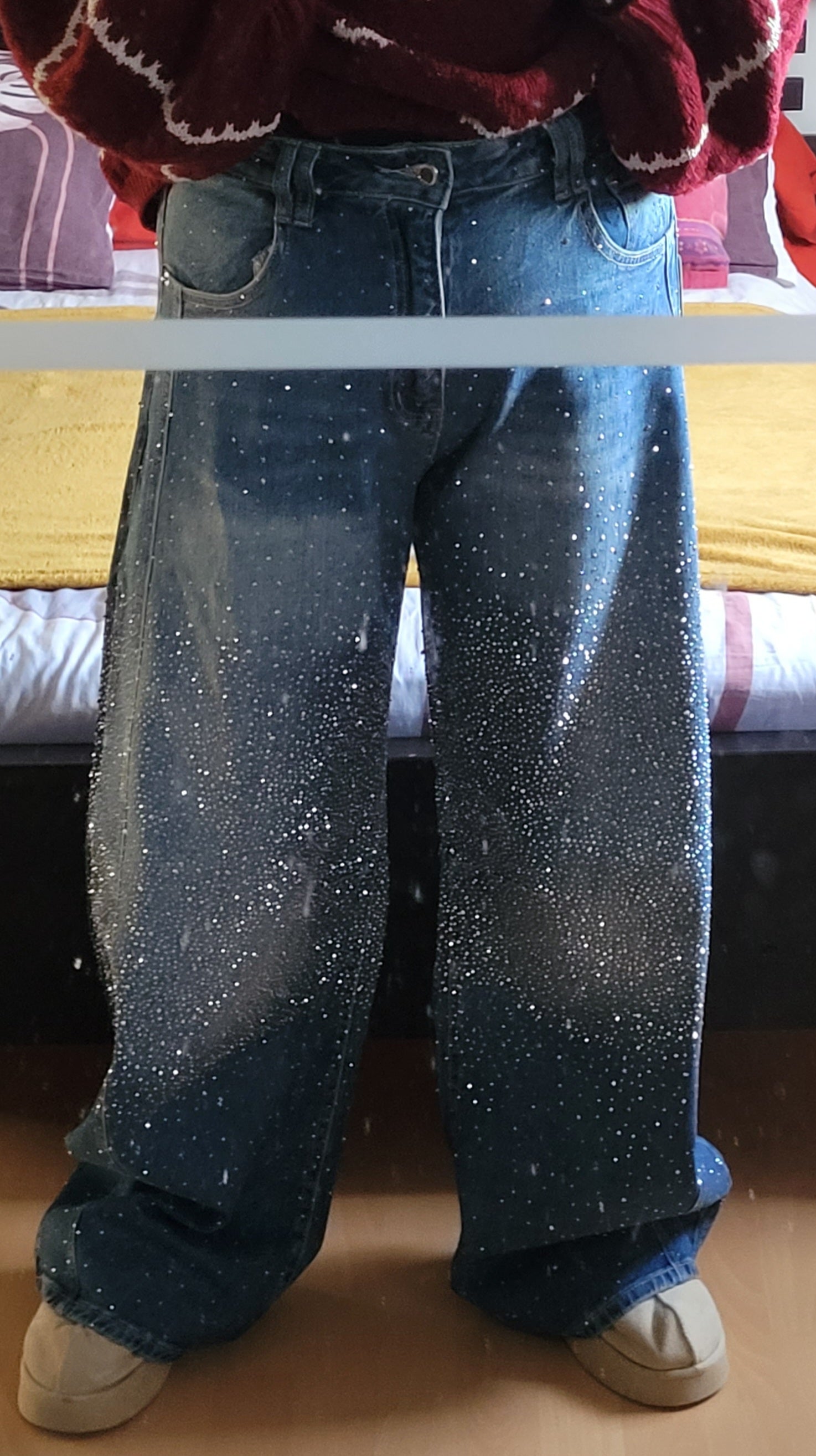 Pantalon jean, coupe Barrel, avec des milliers de strasse recto et verso
